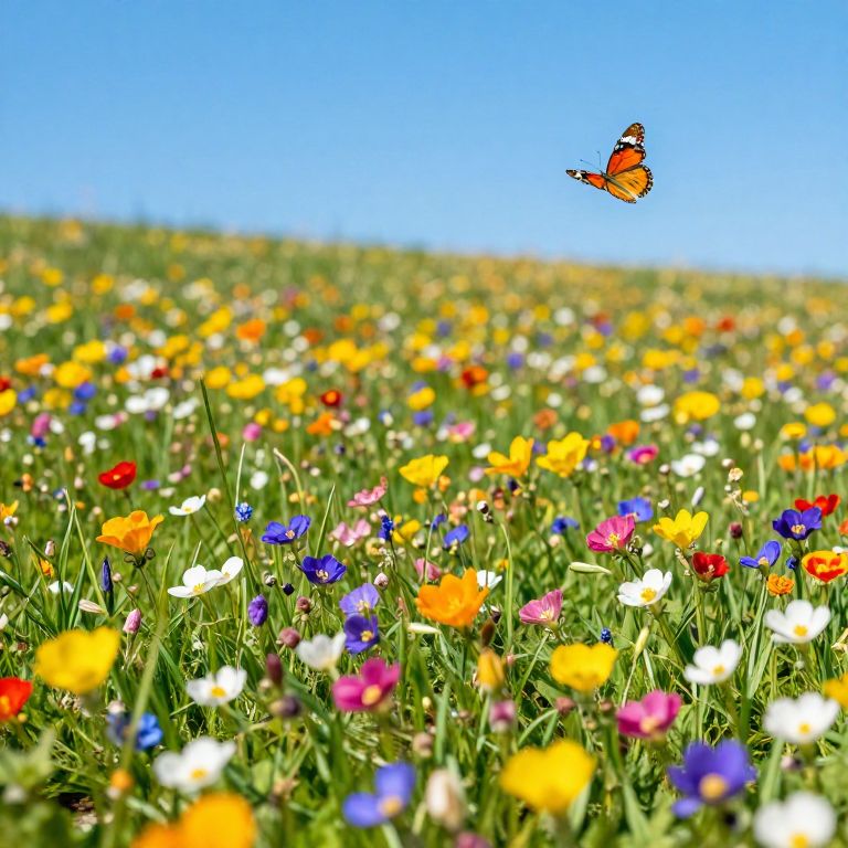 Famous wildflower meadow in full bloom during spring, endless colorful blossoms under a bright blue sky, butterflies fluttering, high detail, vibrant and lively nature scene with soft focus background