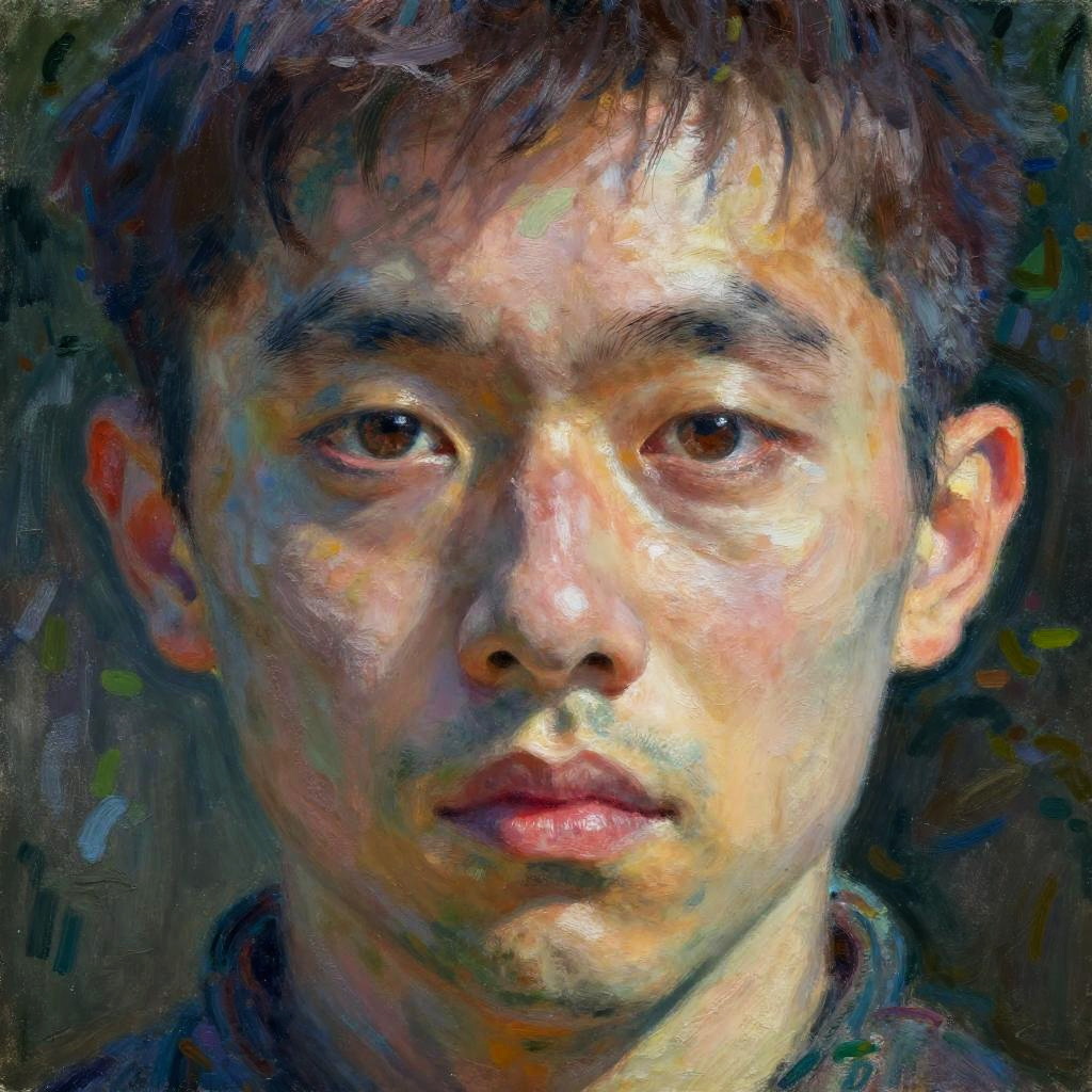 Artistic, oil painting, avant-garde, middle-aged man, resolute expression, anomalous and dynamic colors, melancholia