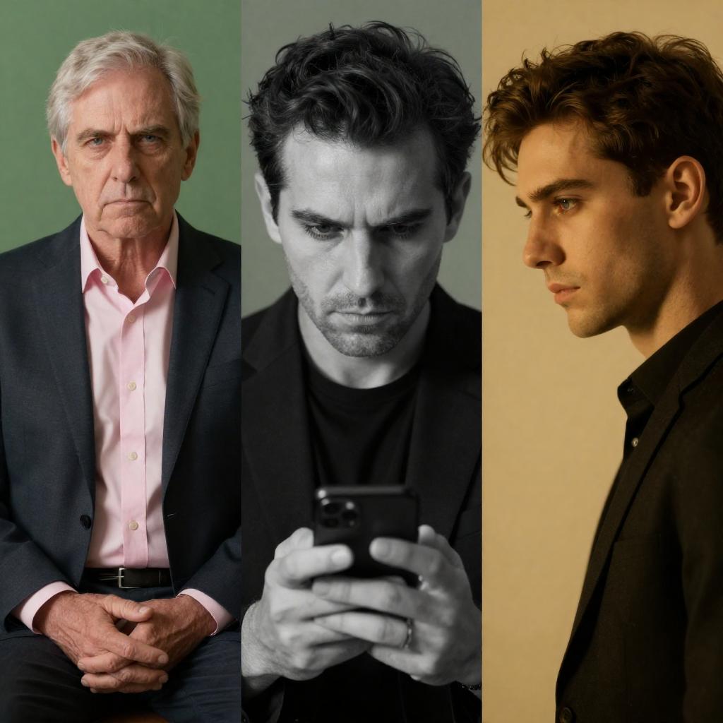 Photograph collage of three men. Left: older man in pink, seated, serious expression, dark suit, green background. Center: middle-aged man, black and white, holding phone, intense gaze, green background. Right: younger man, yellow background, side profile, intense gaze, shadowed face. Green ured background.