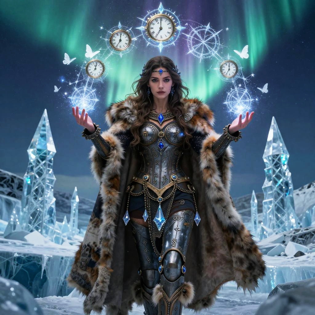 TCG Artwork. A mystical sorceress casting a spell, with fractured ice sigils that emit auroral light and tiny clockwork snow-butterflies radiating from her hands, wearing fur-lined tundra mantle layered over a rune-engraved mechanized cuirass with dangling ice-crystal charms, in a cluster of glass spires and carved ice towers on a drifting iceberg beneath a shimmering polar aurora.