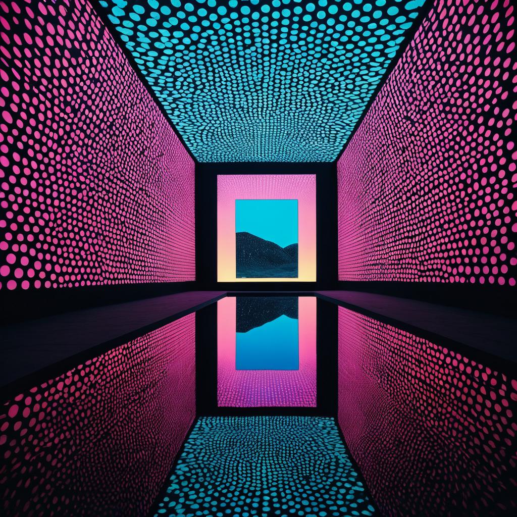 A surreal digital art composition featuring an endless desert landscape seen through a glowing rectangular opening. The room is decorated with pink and blue neon dots covering the walls and ceiling, creating an abstract, immersive environment. A reflective pool on the floor mirrors the vibrant patterns and the desert view, enhancing the sense of infinity and emotional surrealism.