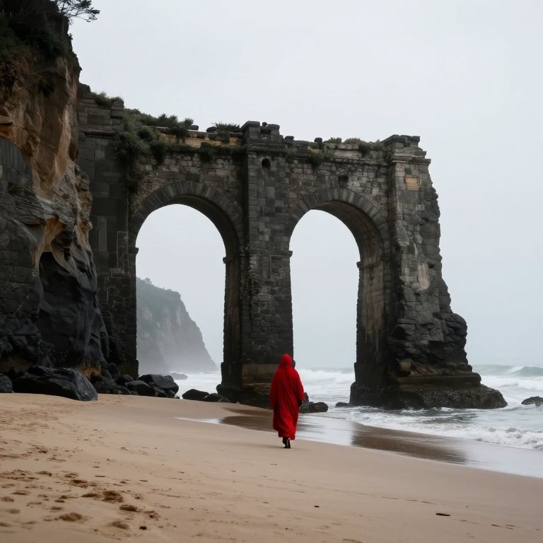Majestic stone arches rise above a sandy beach, connecting towering cliffs as a solitary figure in a vibrant red robe walks beneath them, silhouetted against the misty ocean and distant mountains.