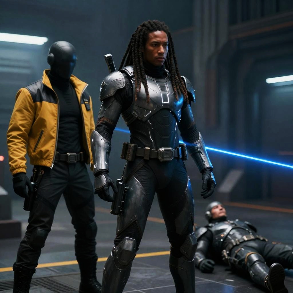 Full body shot of a middle-aged bald man with a silver beard wearing a sleek futuristic black suit with glowing blue accents. He stands confidently on a rain-soaked neon-lit city street with blurred cars and pedestrians in the background, creating a cinematic and high-tech atmosphere.