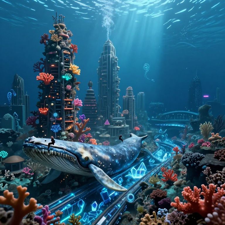 A city rises from the ocean floor, its towers constructed from bioluminescent coral and whale bones, where deep-sea couriers ride giant eels through crystalline subway tunnels.