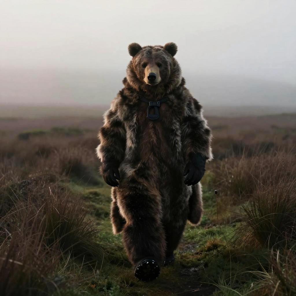 Photograph of a realistic anthropomorphic bear in a fur coat standing on snowy mountain peak with dramatic cloudy sky and distant snow-capped mountains.