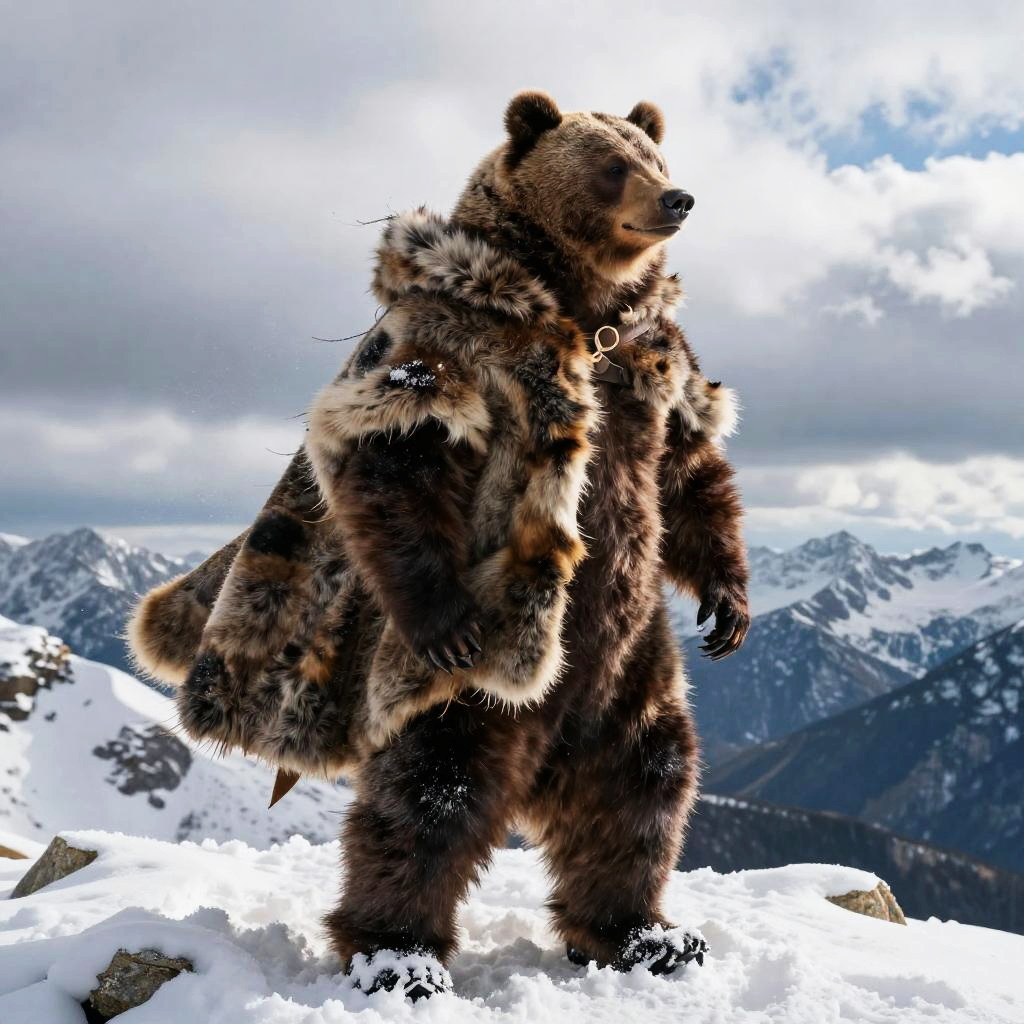 Bearskin cloak draped over a rugged adventurer standing on a snowy mountain peak, detailed fur texture with natural shades of brown and black, icy wind blowing, dramatic cloudy sky in the background, photorealistic style.
