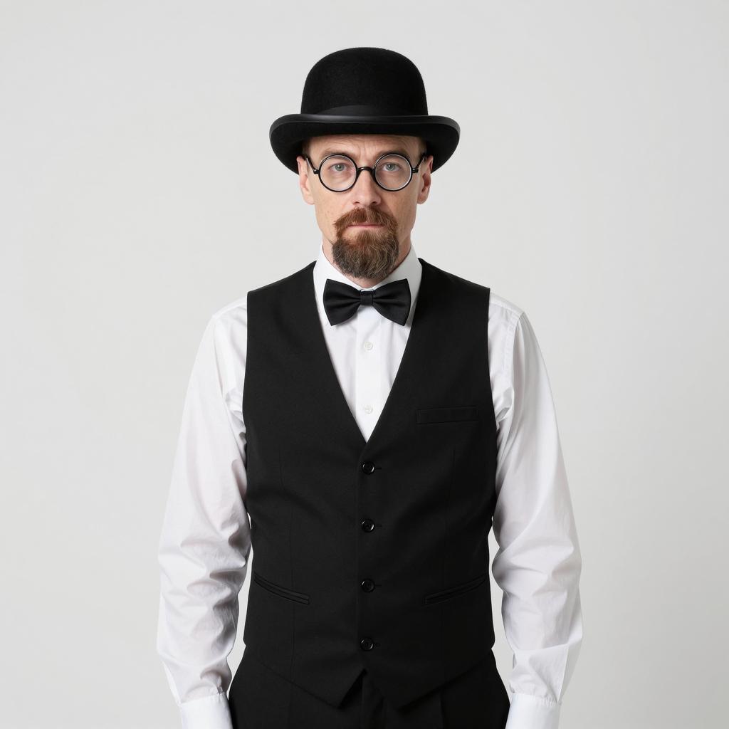 Breaking bad party costume, photograph of a bearded man, wearing a black bowler hat, round glasses, black vest, white shirt, black bow tie, black pants, light skin, neutral expression, studio portrait, white background, vintage style, medium shot, front-facing, slightly overexposed, minimalistic, focused on subject