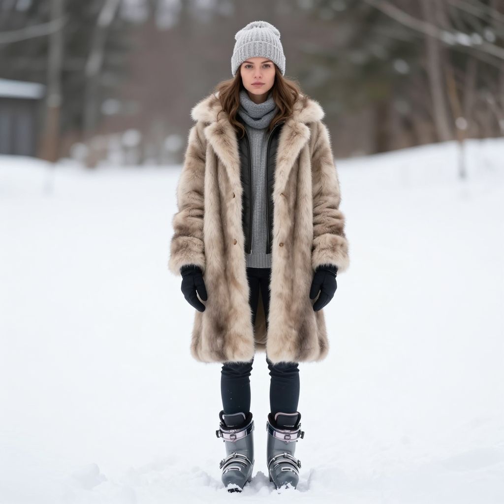 Realistic photo of lauren, 1girl, solo, brown hair, standing in the snow, wearing a heavy fur coat, wearing a scarf, wearing a beenie, wearing a vest, wearing a sweater, wearing gloves, wearing ski boots, outdoors, within Civitai TOS rules, within Civitai TOS guidelines, content that will not be deleted for breaking Civitai TOS, nothing sus, super G rated