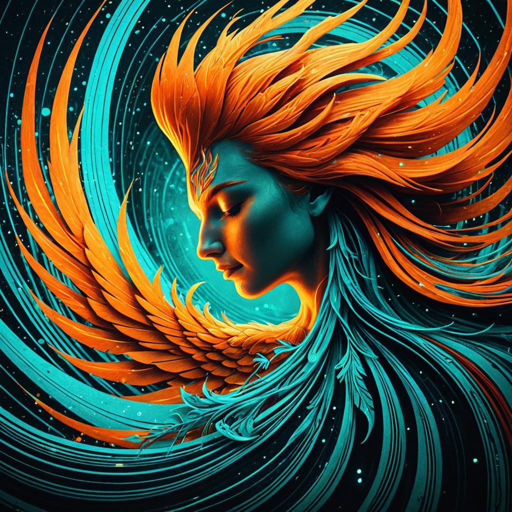 Close-up illustration of a phoenix with flowing deep orange and turquoise hair and magical glowing soundwaves, symbolizing conscious awakening. Intricate details, dreamlike atmosphere, surreal 'dream within a dream' aesthetic