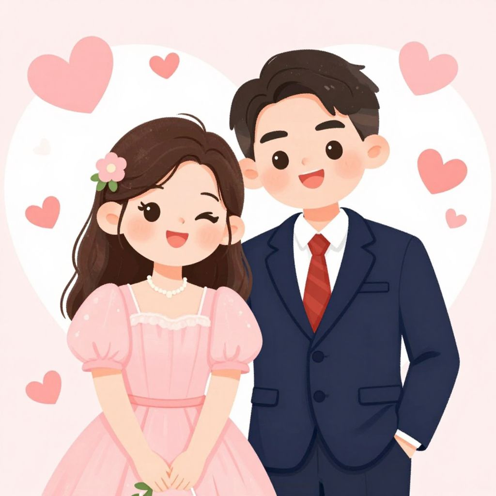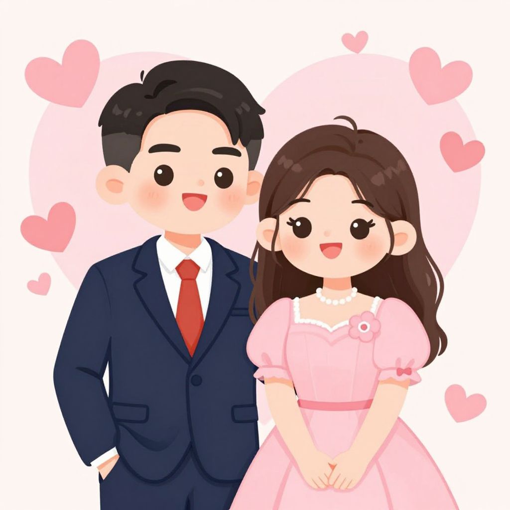 A charming cartoon-style illustration featuring a happy couple dressed in formal attire, with the man in a navy suit and red tie and the woman in a pink dress adorned with a floral accessory, set against a heart-shaped background filled with playful pink hearts and soft pastel tones, evoking a romantic and whimsical atmosphere.