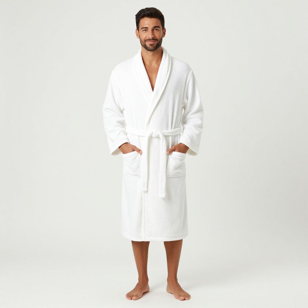 A photograph of a casually handsome man with short, dark hair and a trimmed beard. He's wearing a white, long-sleeved bathrobe with a tied waist and hands in the pockets. He's barefoot and standing against a plain white background. The robe looks soft and fluffy, contrasting with his lightly tanned skin. He's smiling slightly, giving a relaxed vibe.