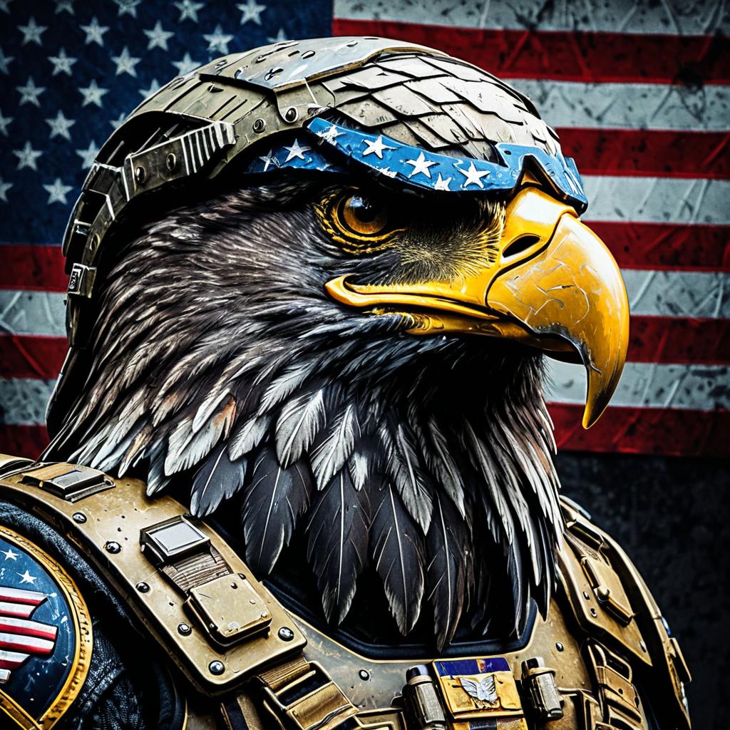 Digital painting of a fierce eagle warrior helmet featuring the American flag design with stars and stripes. The eagle helmet has a battle-worn texture, glowing red eyes, golden beak, and armored plating reminiscent of futuristic combat gear. The background is an American flag, emphasizing patriotism. The detailed artwork highlights neon rim lighting and intricate armor elements.
