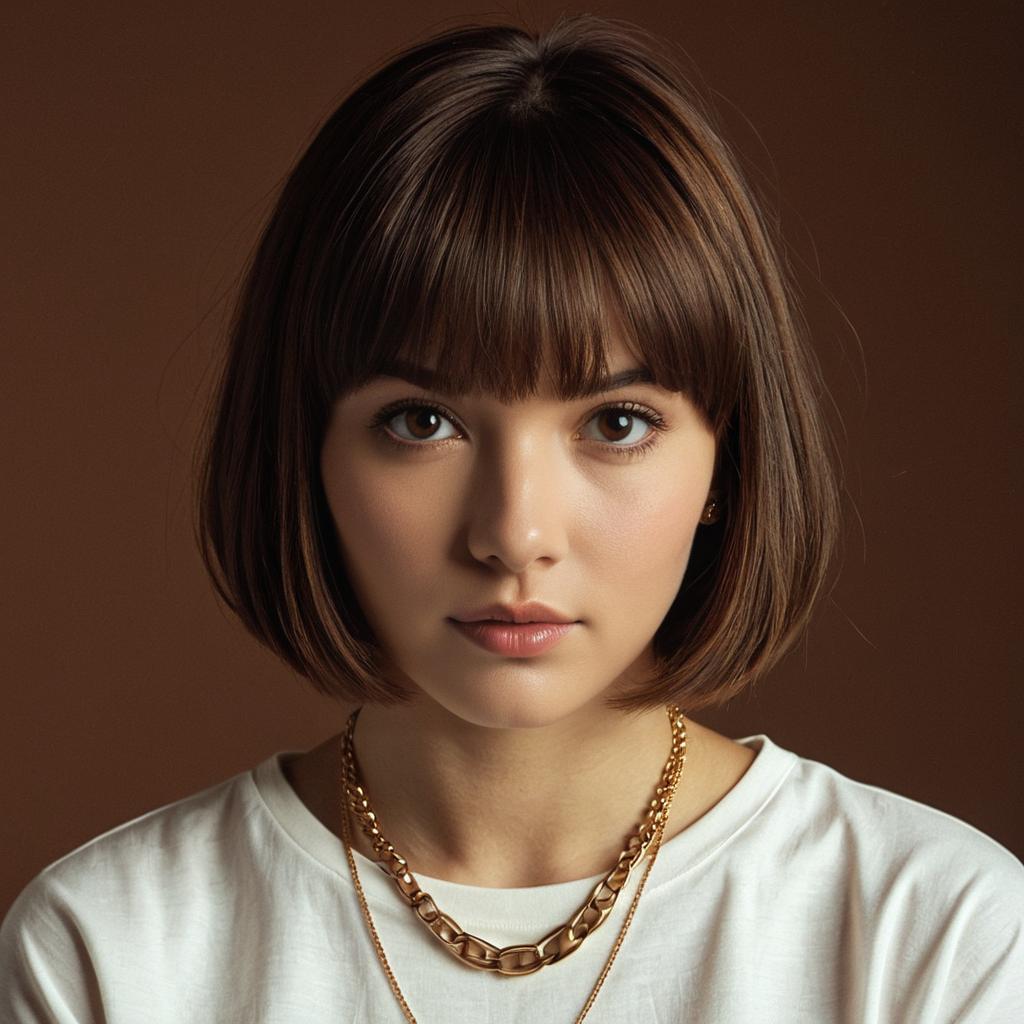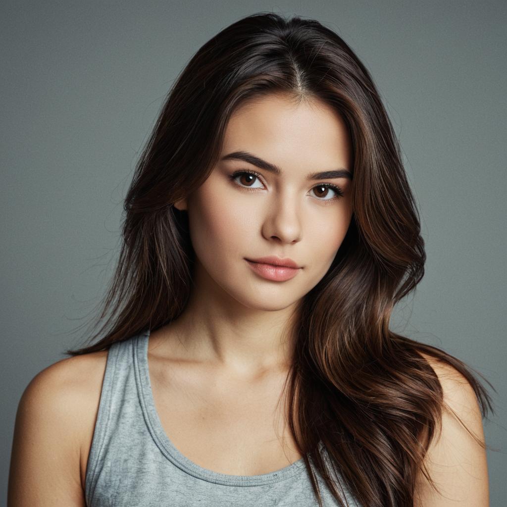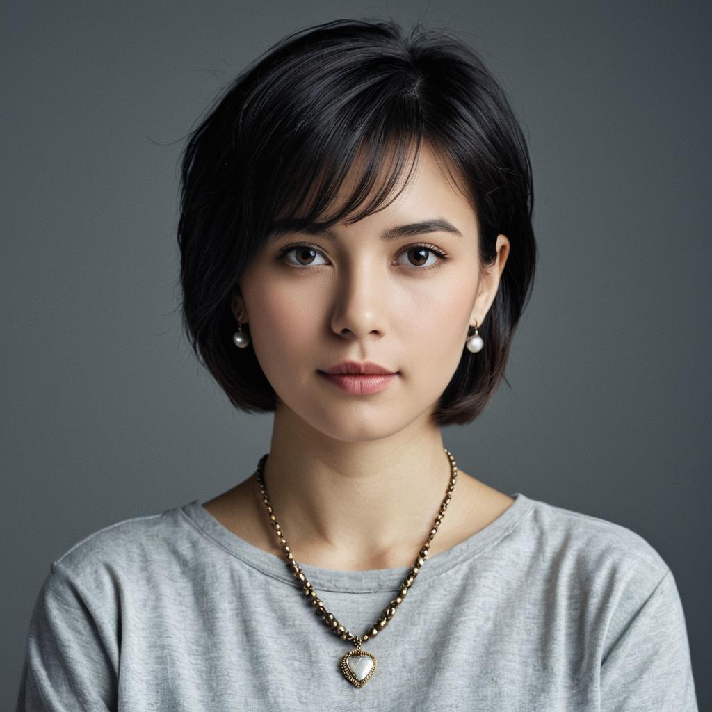 Close-up portrait of a young woman with jet black straight hair wearing a grey ribbed turtleneck sweater and a gold heart-shaped necklace. She has grey eyes and natural makeup, looking directly at the camera with a neutral expression against a plain grey background.