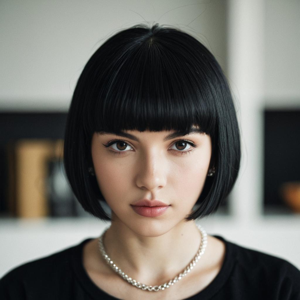Jet black straight wig hair,1girl, solo, black hair, long hair, jewelry, looking at viewer, necklace, grey eyes, upper body, lips, realistic, blurry, turtleneck, sweater, blurry background