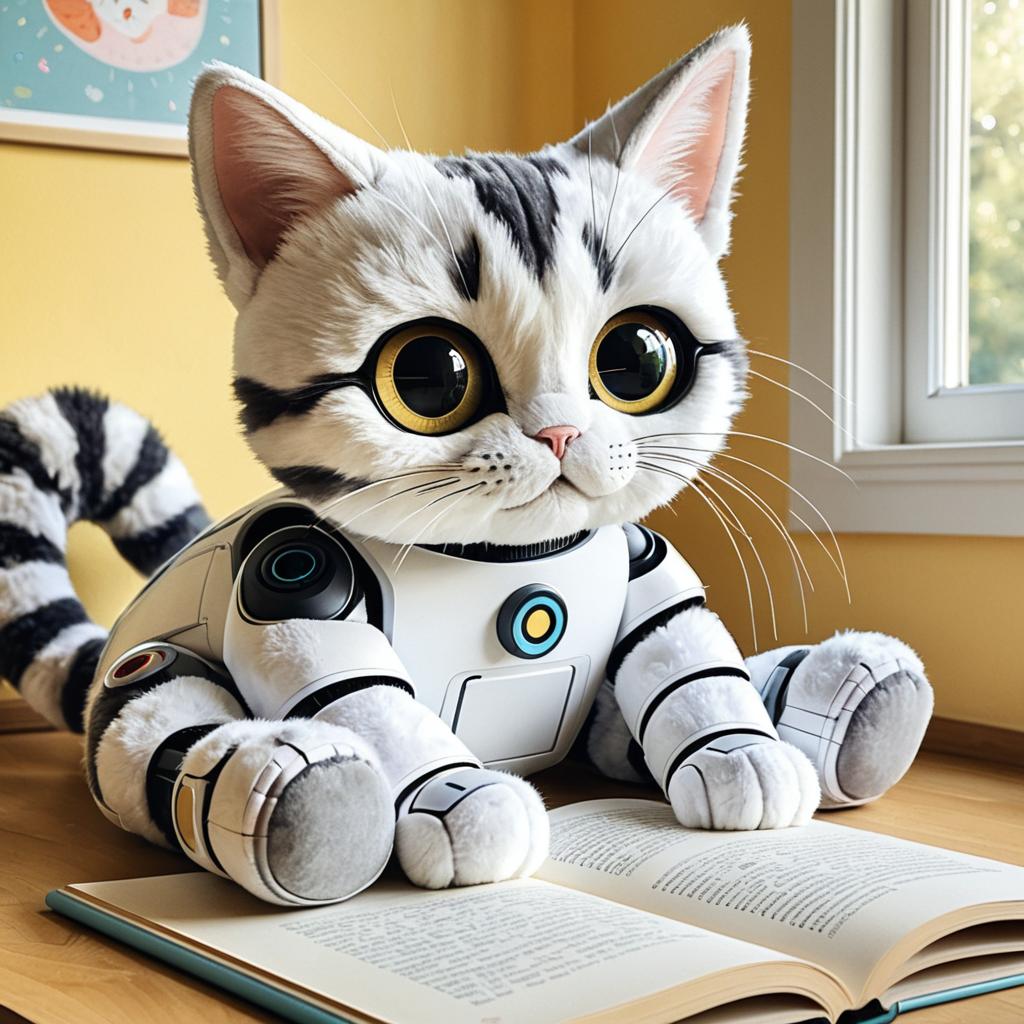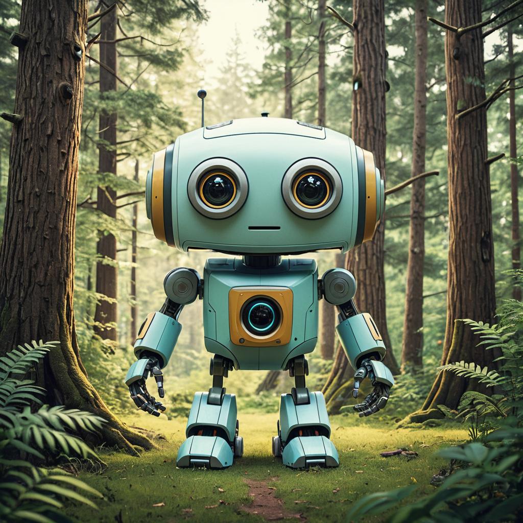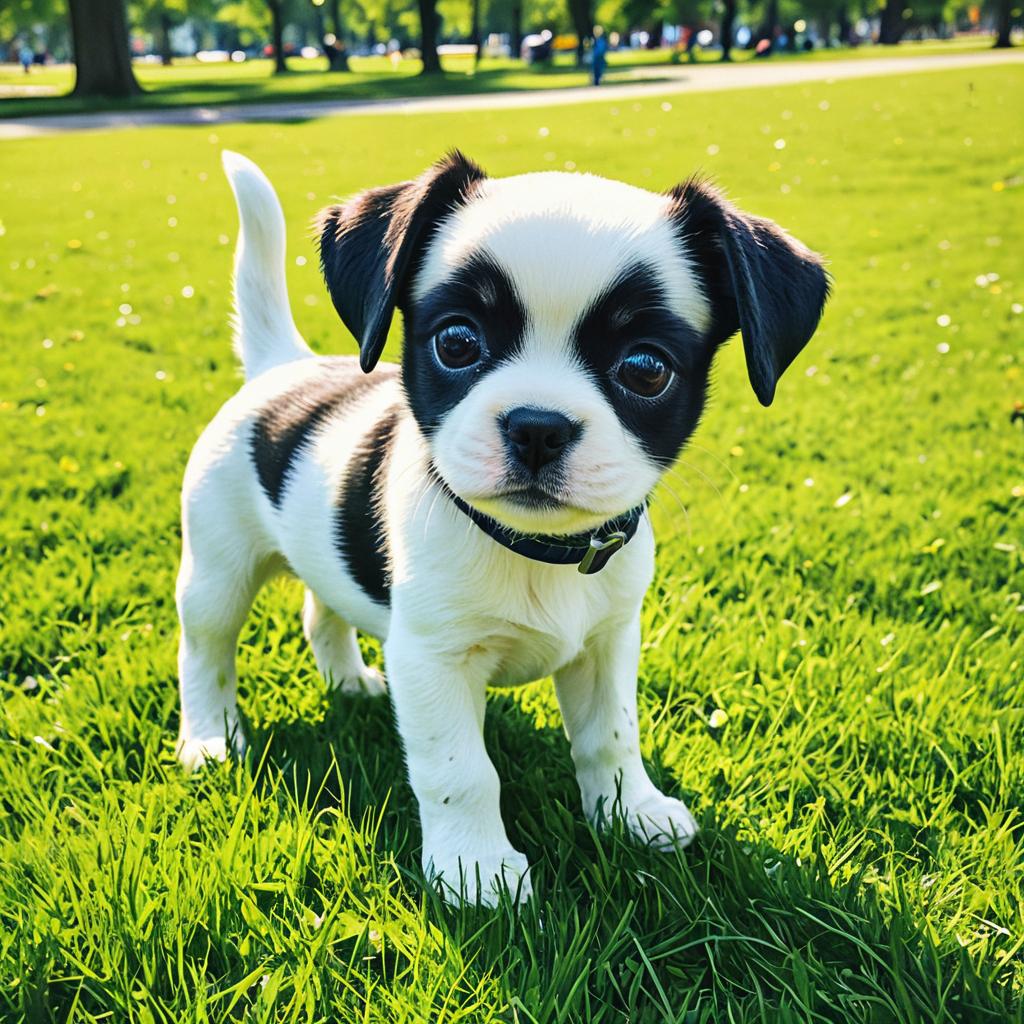 Illustration of a playful android puppy with big green expressive eyes and smooth white fur with black patches, standing on green grass in a sunny park. The digital artwork features a family-friendly, bright watercolor style with soft shading and vibrant colors.