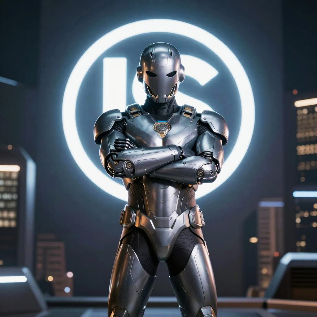 Superhero posing with arms crossed in front of glowing emblem, sleek armor with metallic finish, cybernetic enhancements visible, futuristic cityscape behind, high contrast