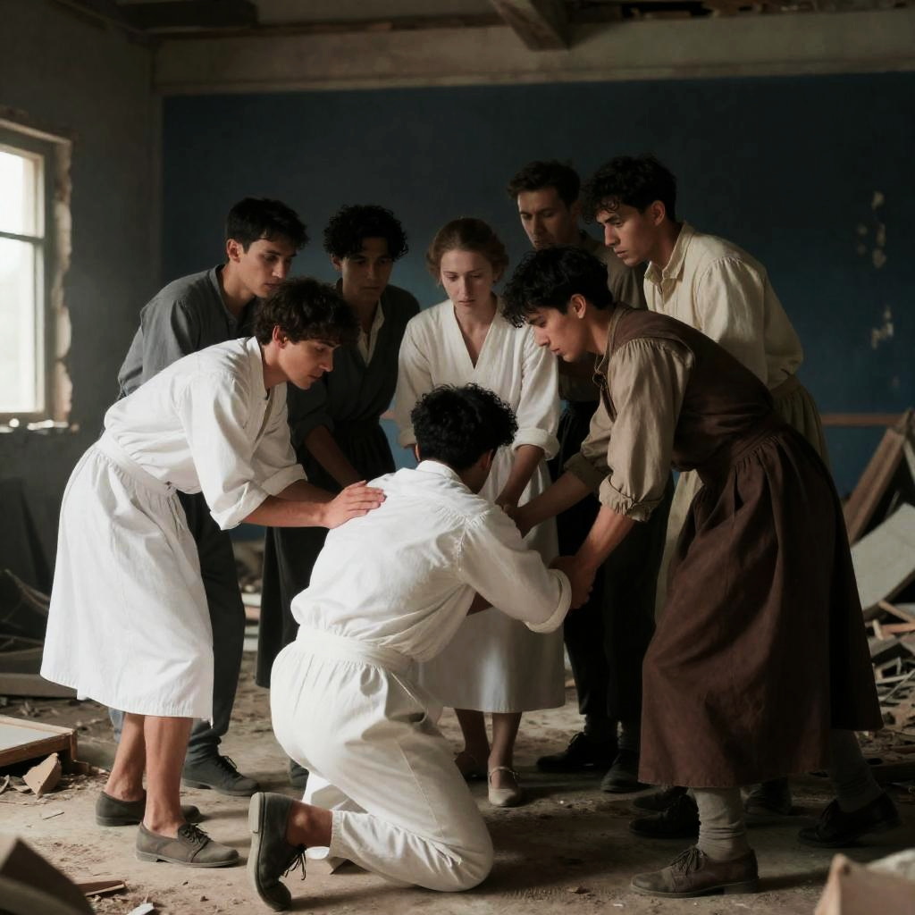 Photograph of a group of people in period clothing inside a dark, partially destroyed building. Eight men and one woman are assisting each other. Some wear white, others brown and gray. One man in white kneels, others stand. Broken furniture and debris on the floor. Dark blue wall in background. Intense expressions on faces.