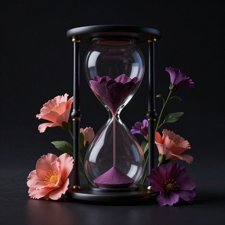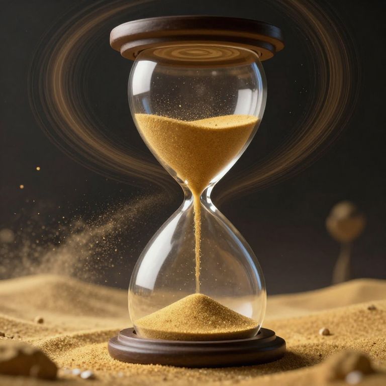 A colossal hourglass defies gravity, its golden sand cascading upwards into a swirling vortex of light and particles, suspended in a dreamlike landscape where reality bends and time seems to flow backward.