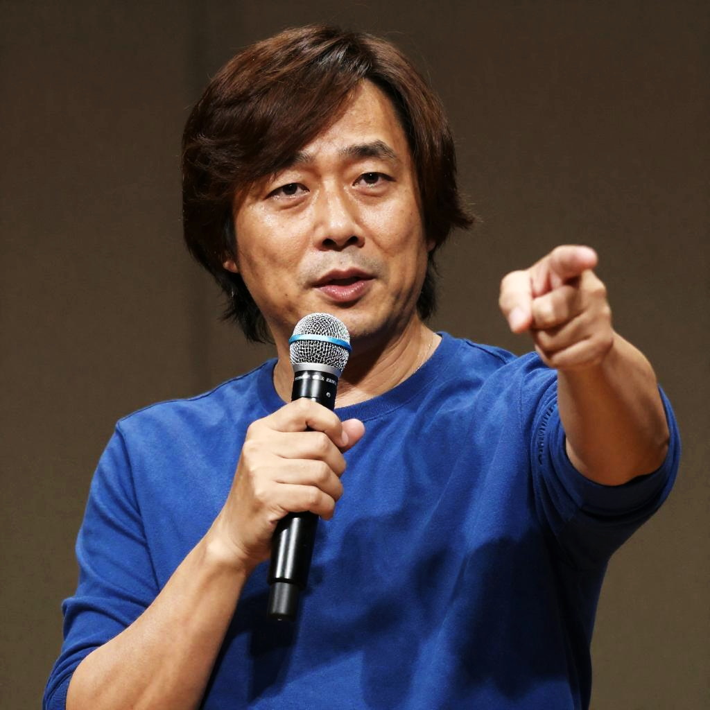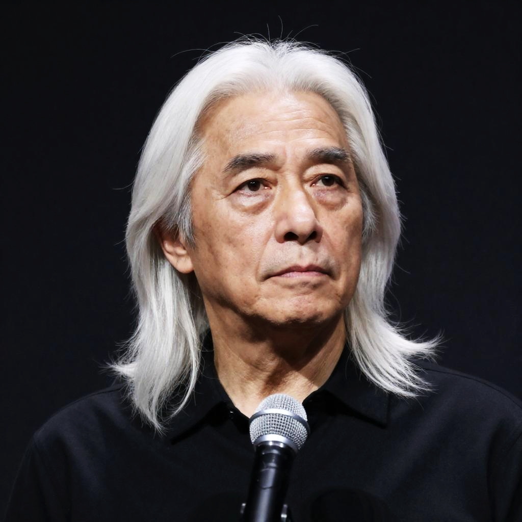 Photograph of a middle-aged man with long, straight white hair, wearing a black shirt, standing in front of a microphone. He has a serious expression, fair skin, and a slightly angled head. Dark, ured background. Close-up.