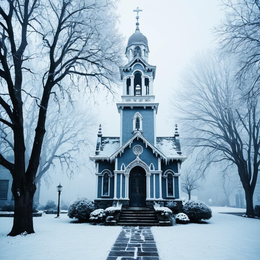 A charming Victorian-style bell tower with intricate architectural details, standing tall in frosted early winter fog, the front yard adorned with glistening icicles and dustings of snow, a winding stone pathway leading to the entrance, evokes a warm, cozy fall atmosphere with cool blue and pure white tones