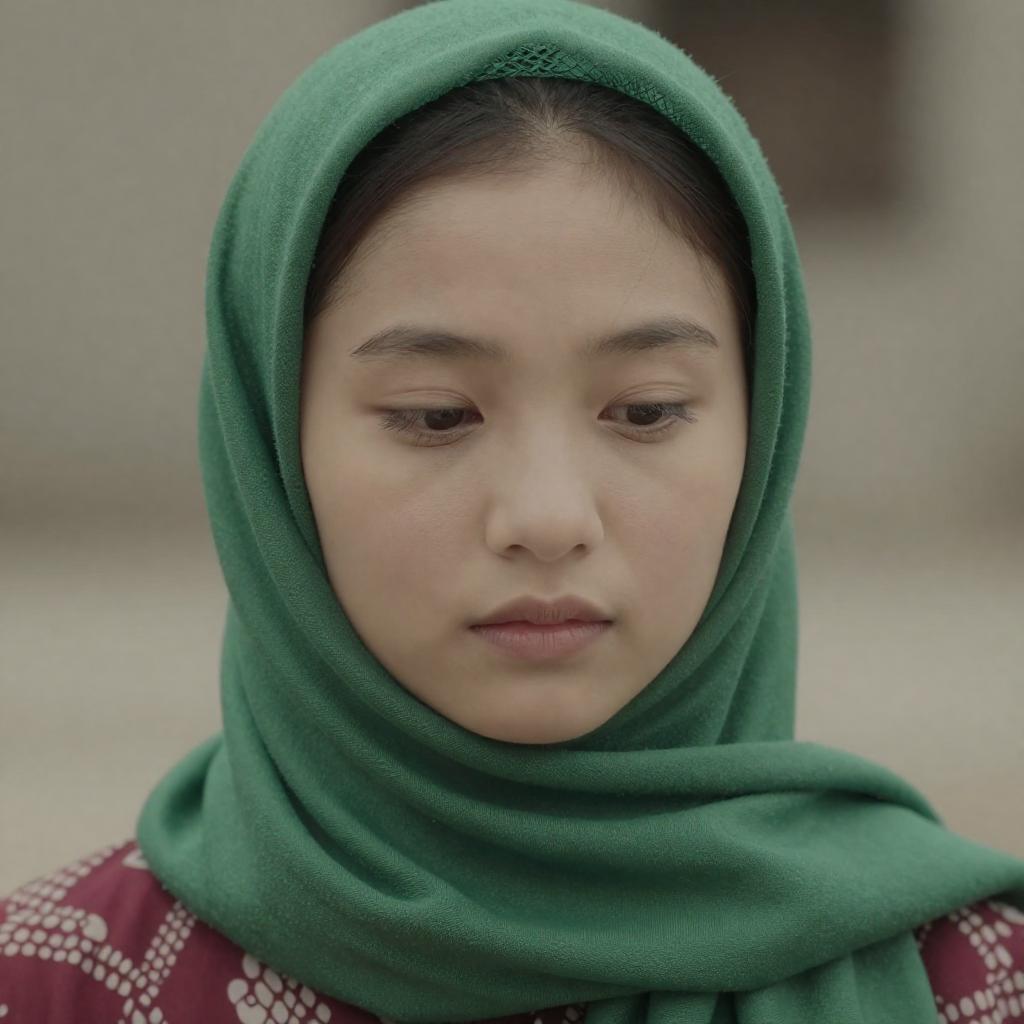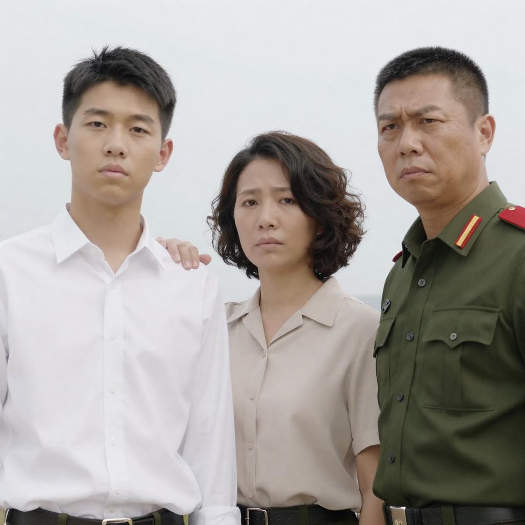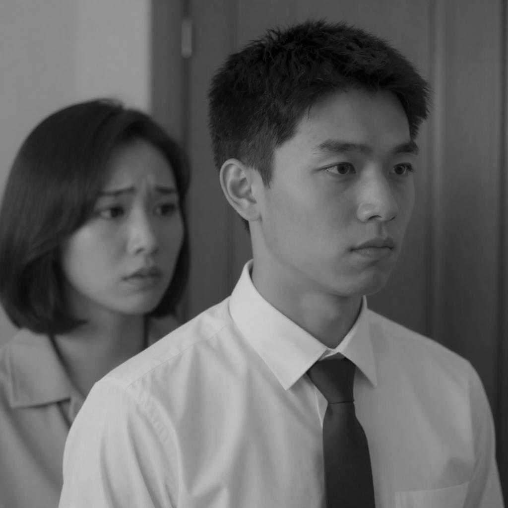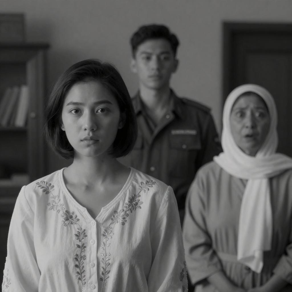 Black-and-white photograph of three people. Foreground: young woman with short hair, light-colored dress, floral embroidery, serious expression. Background: young man with dark hair, military-style jacket, neutral expression. Right: older woman with white headscarf, light robe, surprised expression. Indoor setting, dim lighting, wooden furniture on left.