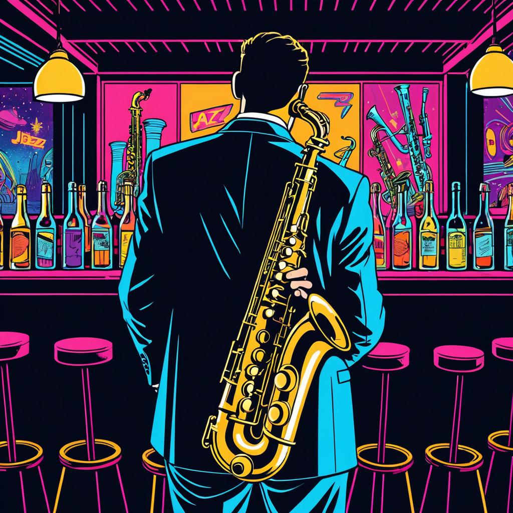 Vibrant comic-style line art of an android jazz musician viewed from behind, holding a golden saxophone. Set in a futuristic space pier jazz club in New York 2040, the scene features neon-lit bar shelves filled with various bottles and saxophones, under warm pendant lights with a colorful and dynamic composition.