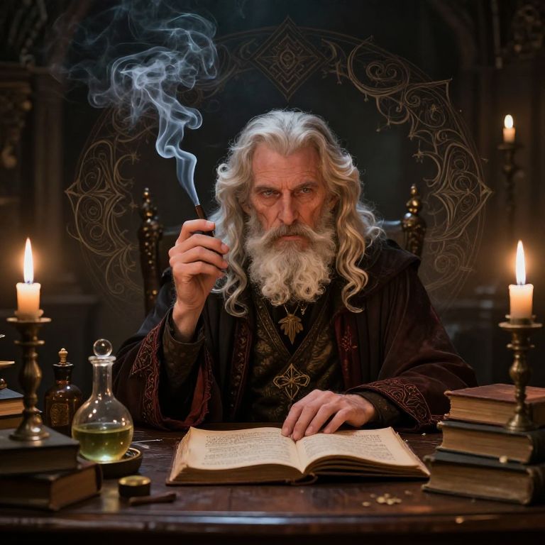 Photograph of an elderly white man with long, wavy white hair and a full white beard, wearing a dark, ornately embroidered robe, sitting at a wooden desk. He holds a smoking pipe in his right hand and gazes intensely at an open book in front of him. The dimly lit room features two lit candles on either side of the desk, a glass flask, and several stacked books. The background is dark with intricate, swirling patterns. The overall atmosphere is mystical and scholarly, evoking a sense of ancient wisdom and magic.