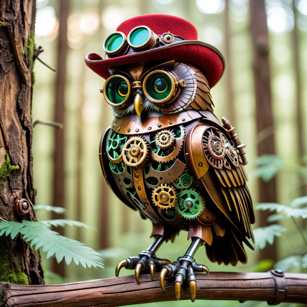 A steampunk mechanical owl perched on a wooden branch in a forest, intricate metal details with gears and bolts, wearing a large red-brown hat with goggles, realistic lighting with soft green and brown blurred background, warm amber and bronze color palette emphasizing the metallic textures