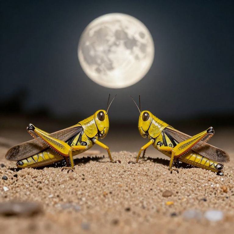 Two vibrant yellow grasshoppers with intricate patterns stand poised on sandy terrain, their antennae alert as they face each other against the backdrop of a luminous, cratered moon glowing softly in the dark sky.