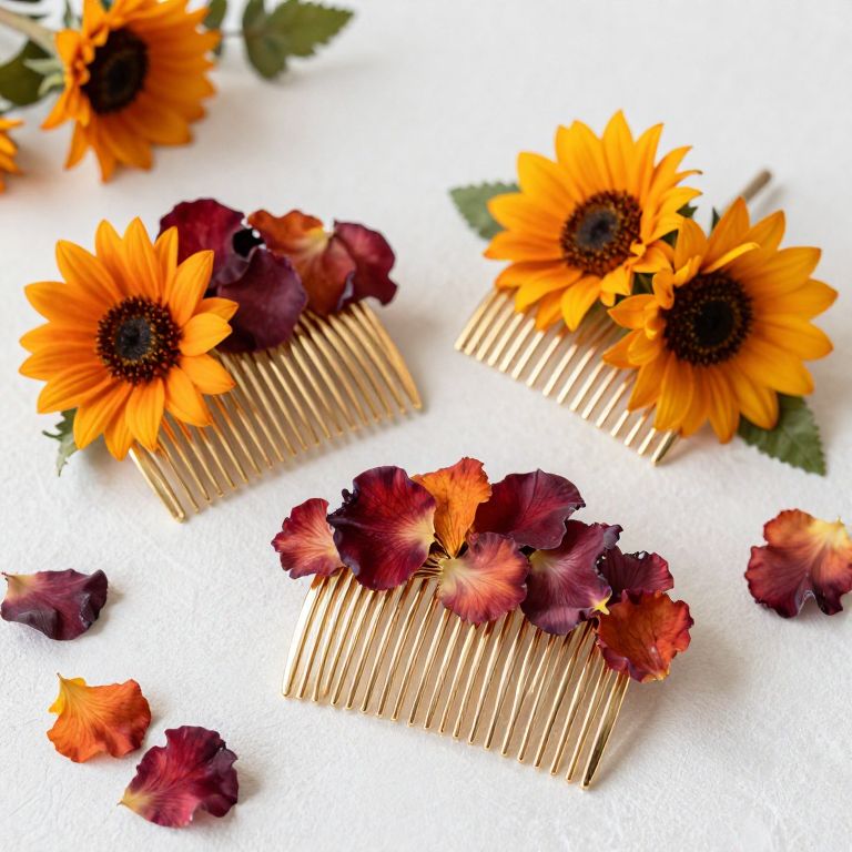Vibrant bridal hair combs featuring gold prongs adorned with plum wine petals and orange sunflower daisies, showcasing rustic chic and vintage woodland style for a fall wedding ensemble.