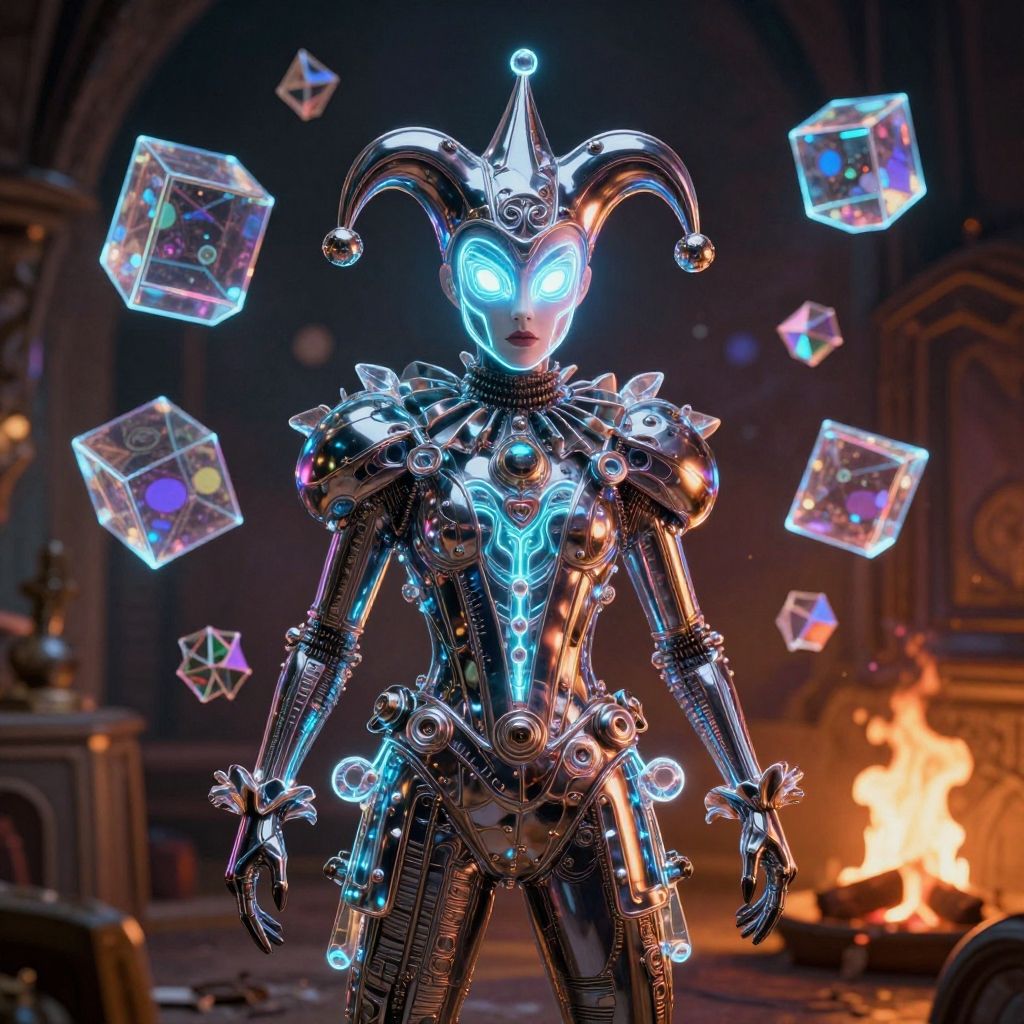 Front!!! shot of a court jester!!! character, neon bioluminescent hypercubes, dark holography!!!, future, chrome, crystalline edges, (((intricate))), elegant, highly detailed, centered, (((artstation, concept art, smooth, sharp focus, artgerm, Tomasz Alen Kopera, Peter Mohrbacher, donato giancola, Joseph Christian Leyendecker, WLOP, Boris Vallejo))), ((raytracing)), mugshot!!!!!, ugly!!!!!!, octane render, nvidia raytracing demo, grainy, muted, 8K, digitalblasphemy, metatron, campfire, crackling flames, cozy warmth, digital image of a fantastical jester figure surrounded by floating geometric shapes in a neon-lit, futuristic environment.bokeh Nikon D850 digital painting elegant extremely detailed intricate 8k cinematic lighting portrait 4k beautiful high detail fantastic view hyperrealistic ultra detailed 4K 3D crisp quality colourful hdr very cute cinematic postprocessing Van Gogh acrylic art Giuseppe Arcimboldo John James Audubon Gian Lorenzo Bernini