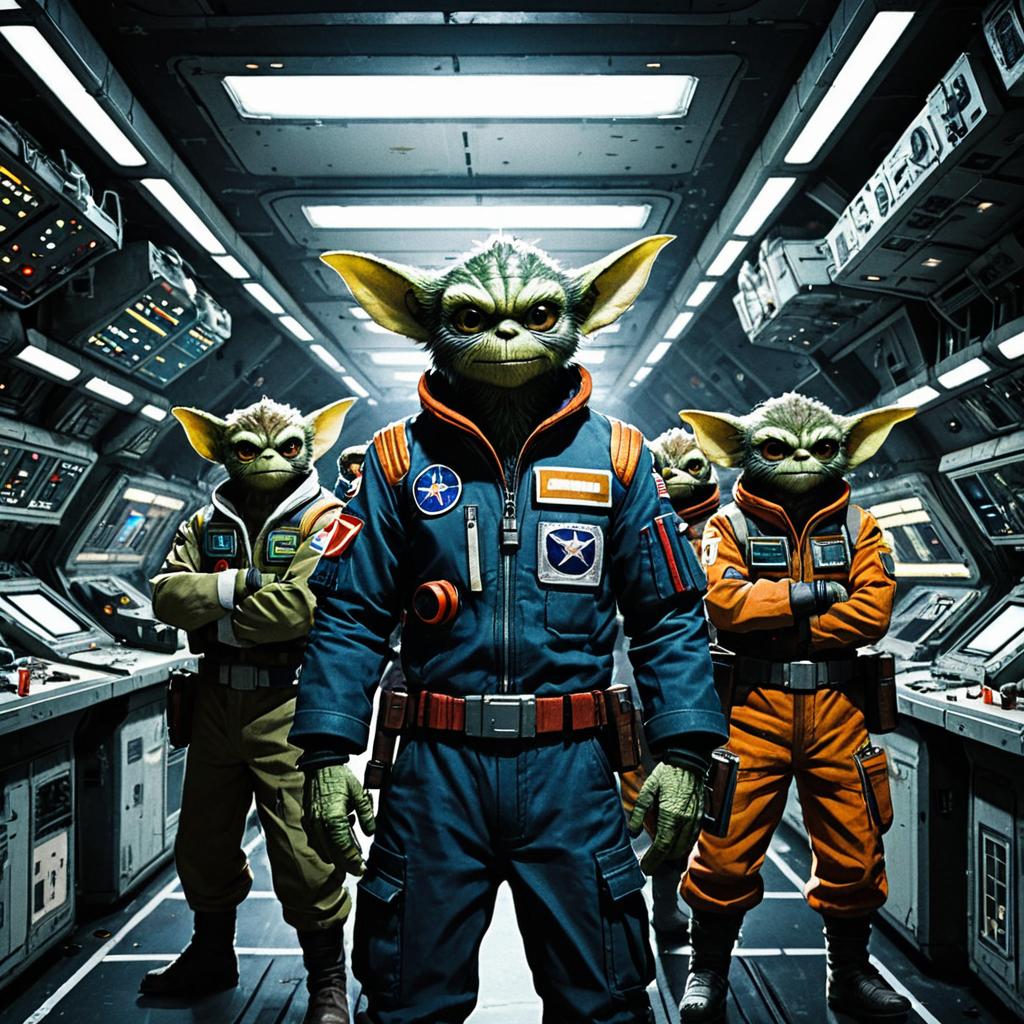 A squadron of four gremlin-like alien smugglers dressed in colorful, detailed pilot and mechanic suits standing confidently inside a futuristic, abandoned space station control room. The characters feature large ears, green skin, and expressive faces, rendered in a dynamic anime style inspired by Shinichiro Watanabe. The atmospheric corridor showcases high-tech panels, consoles, and ambient lighting.