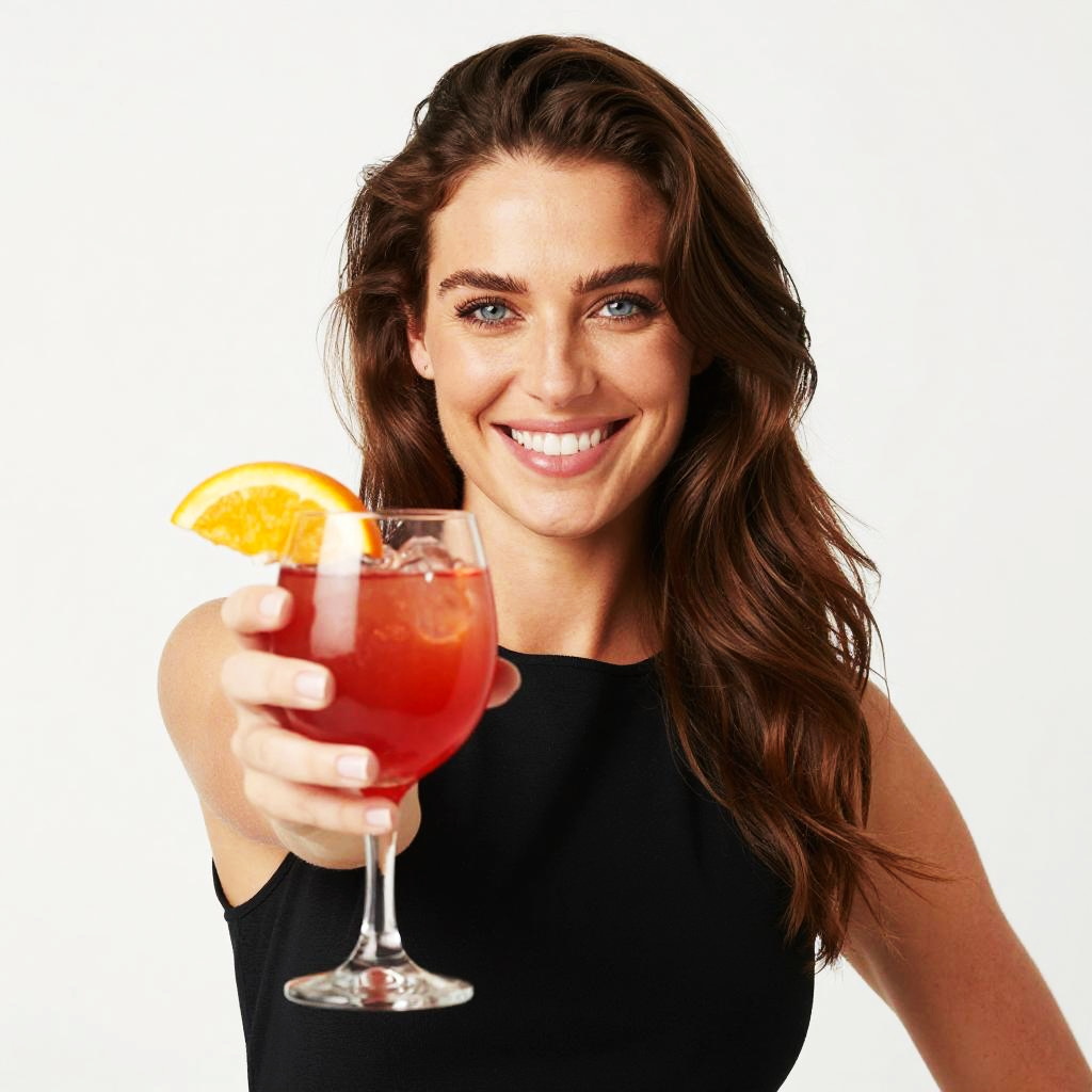 Photograph of a smiling woman with long brown hair and blue eyes, wearing a sleeveless black top. She's holding up a glass of red cocktail with an orange slice garnish, extending it towards the camera. The background is completely white, making her and the drink the focal points. She looks happy and confident, with a casual, friendly vibe.