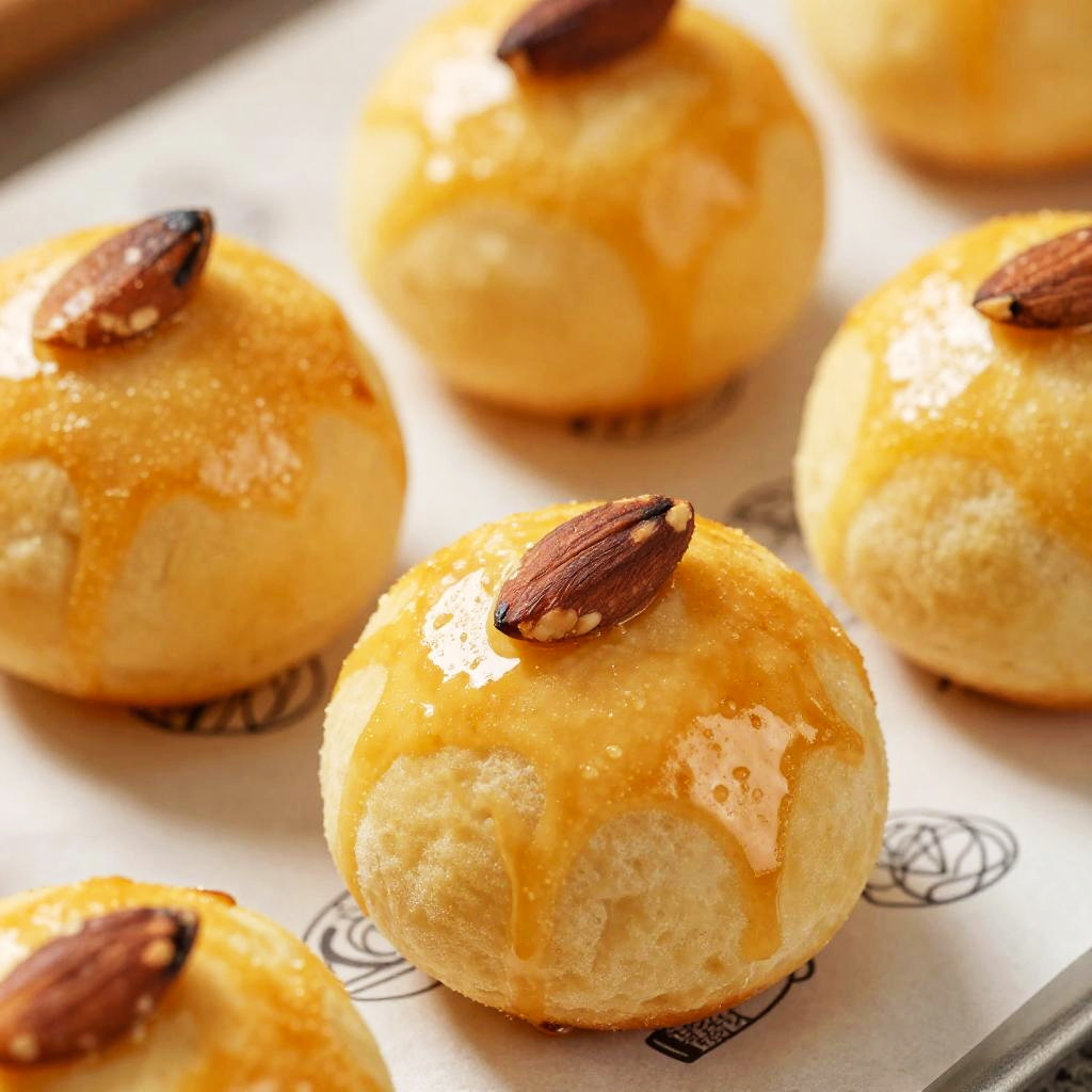 Close-up photo of golden-brown, shiny pastry balls with small, dark brown almond slices on top. The pastries have a smooth, glossy texture and are arranged on a white paper with black doodles. The image has a bright, warm tone, highlighting the pastries' glistening surface. The background is blurred, focusing attention on the delicious-looking treats in the foreground.