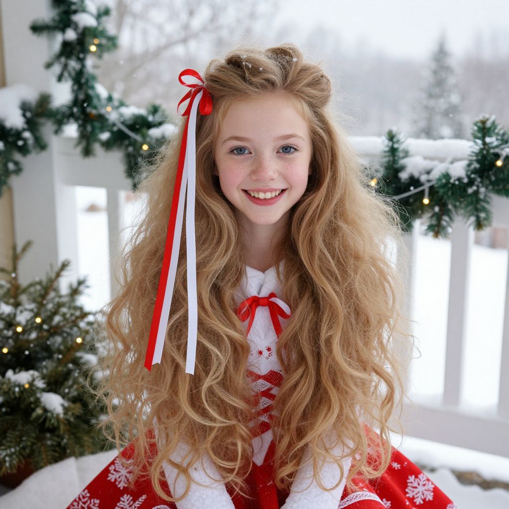 A cheerful teenage girl with a long, voluminous fluffy hairstyle in natural blonde, dressed in a festive holiday costume with red and white ribbons and snowflake motifs, sitting on a winter porch decorated with evergreens and lights, her face has bright blue eyes and a joyful, radiant smile, with snow gently falling in the background.