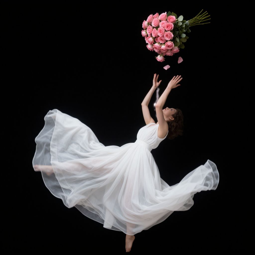 Photograph of a woman in a flowing white dress, leaping with arms raised, catching a bouquet of pink roses against a black background.