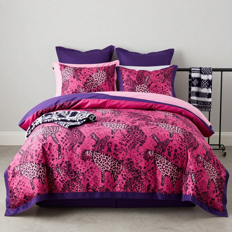 Crib featuring a vibrant 9-piece bedding set with leopard print patterns in hot pink and purple accents, complemented by matching pillows and a decorative throw blanket draped over the railing.