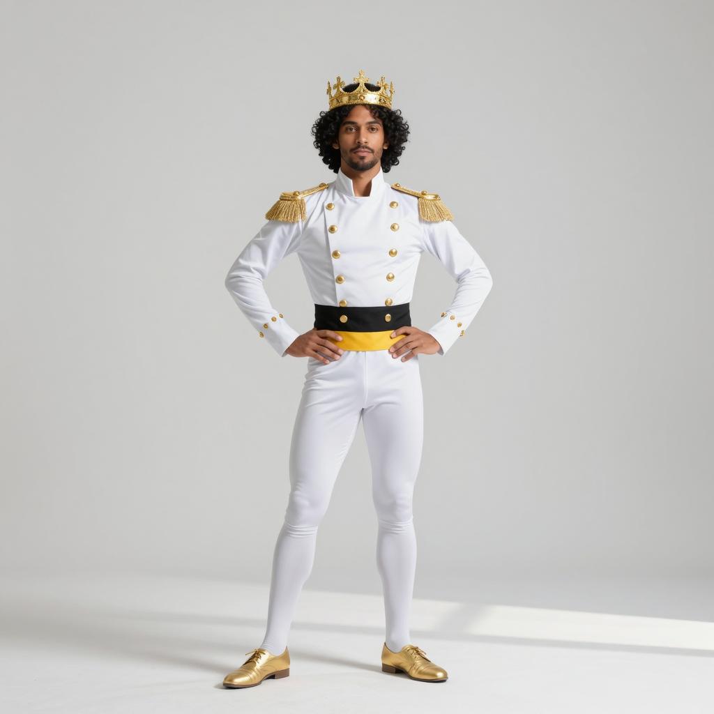 Professional latin dance, photograph of a muscular, medium-dark-skinned man standing confidently, wearing a dark blue, long-sleeve, V-neck shirt with ornate black shoulder pads, and a gold, asymmetrical, wrapped skirt over black leggings and black boots, short black hair, neutral beige background, arms crossed over chest, serious expression, full body shot, studio lighting, realistic style, casual pose, fashionable outfit, ethnic-inspired clothing, standing on one leg, slightly turned to the side