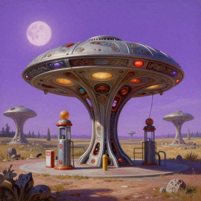 Painting of syd mead artlilery scifi organic shaped gas station with ornate metal work lands on a farm, fossil ornaments, volumetric lights, purple sun, moebius