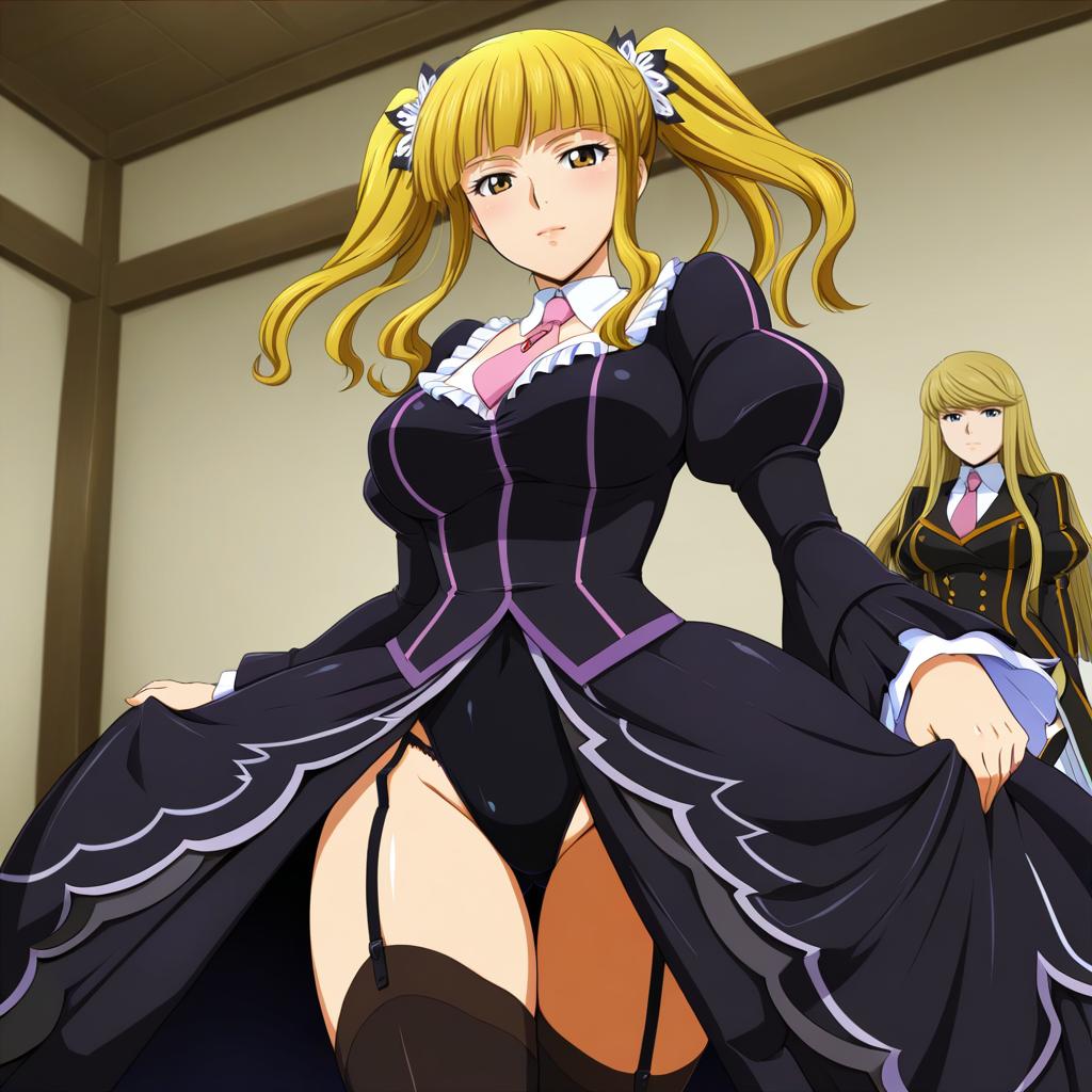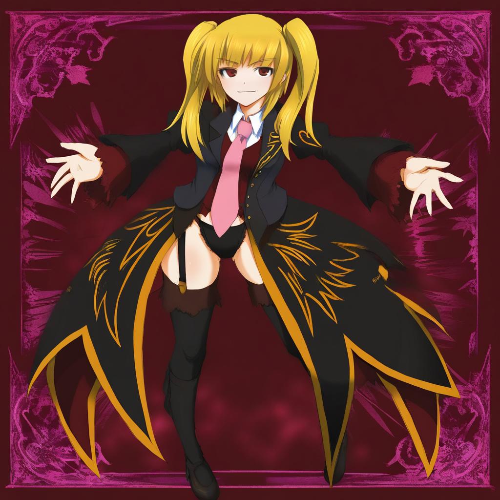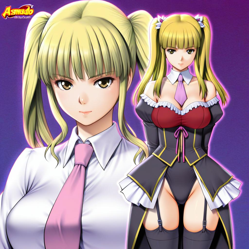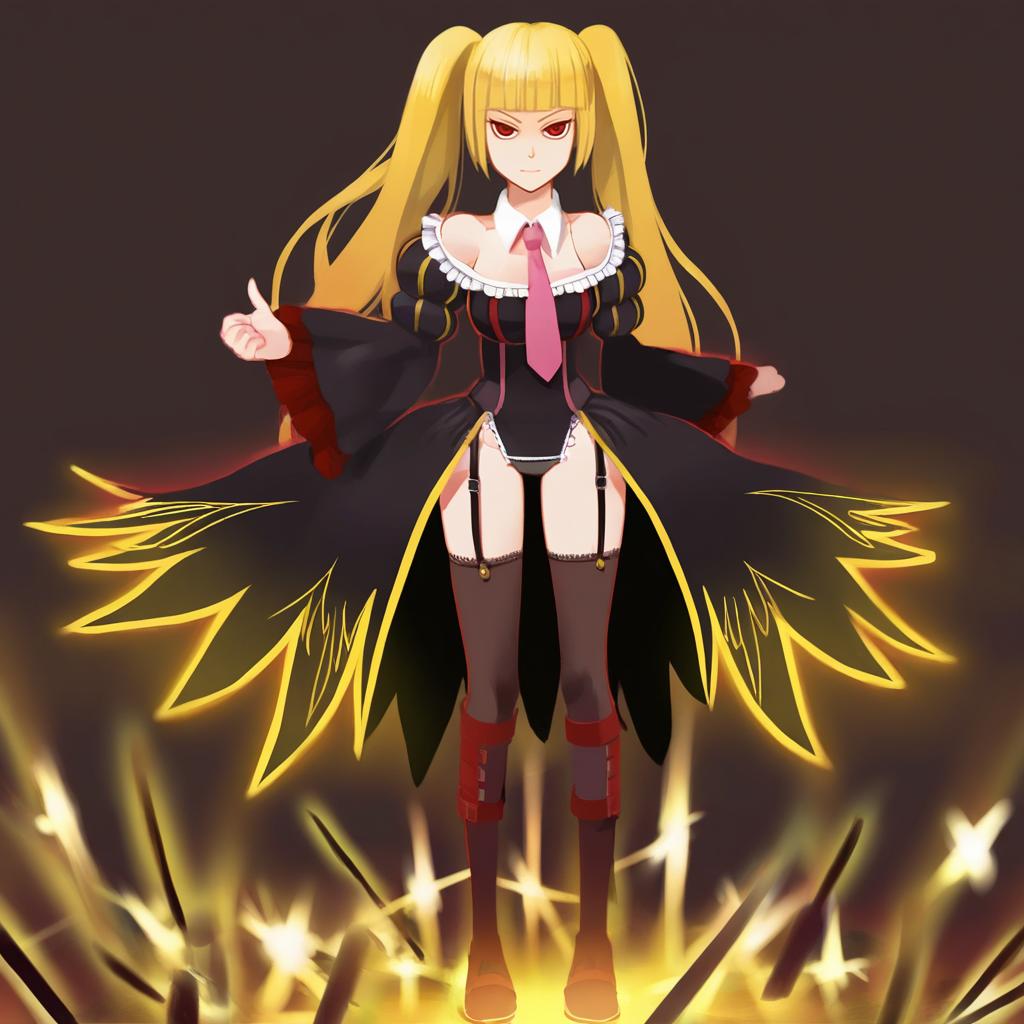 Asmodeus (umineko), umineko no naku koro ni, 1girl, red eyes, blonde hair, long hair, twintails, showgirl skirt, thighhighs, pink necktie, garter straps, by artist puge, illustrious