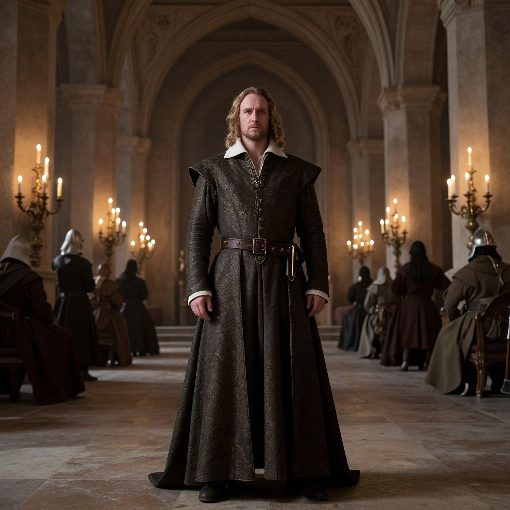 Photograph of a tall, middle-aged man with long, wavy blonde hair standing in a dimly lit, Gothic-style hall. He wears a dark, textured, medieval-style robe with a white shirt underneath and a brown belt. The background features arched ceilings, stone walls, and multiple lit candelabras. Several robed figures, some with hoods, are seated on both sides, creating a solemn, historical atmosphere. The man's expression is serious, and the lighting highlights his figure against the shadowy background. The overall mood is somber and medieval.