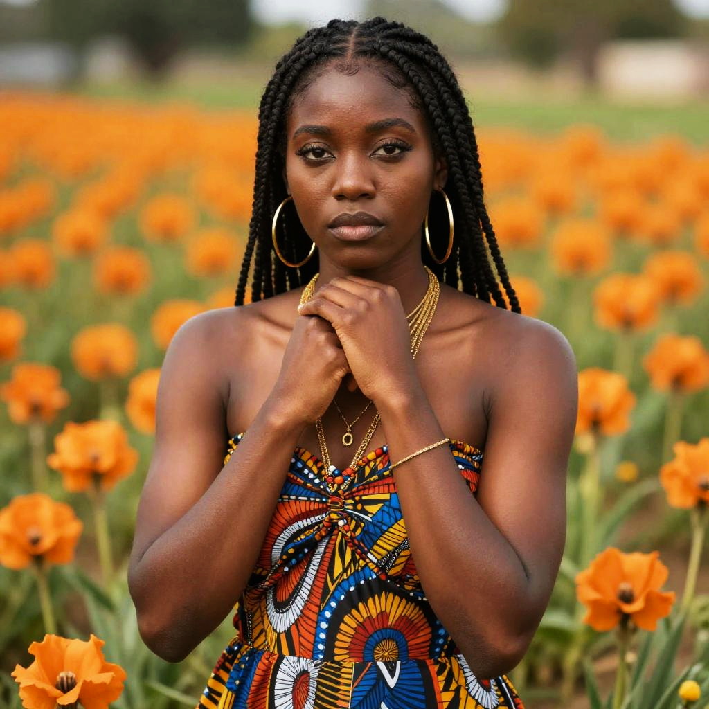 This is a photograph of a dark-skinned African woman with a serious expression, standing in a field of vibrant orange and red flowers. She is wearing a light beige, silky scarf draped over her head and shoulders, with a silver, patterned blouse underneath. Her hair is neatly tucked under the scarf, and she has small gold hoop earrings. The background is softly blurred, emphasizing the bright, colorful flowers. The lighting highlights her facial features and the texture of her scarf, creating a striking contrast with the colorful flowers and her dark skin.
