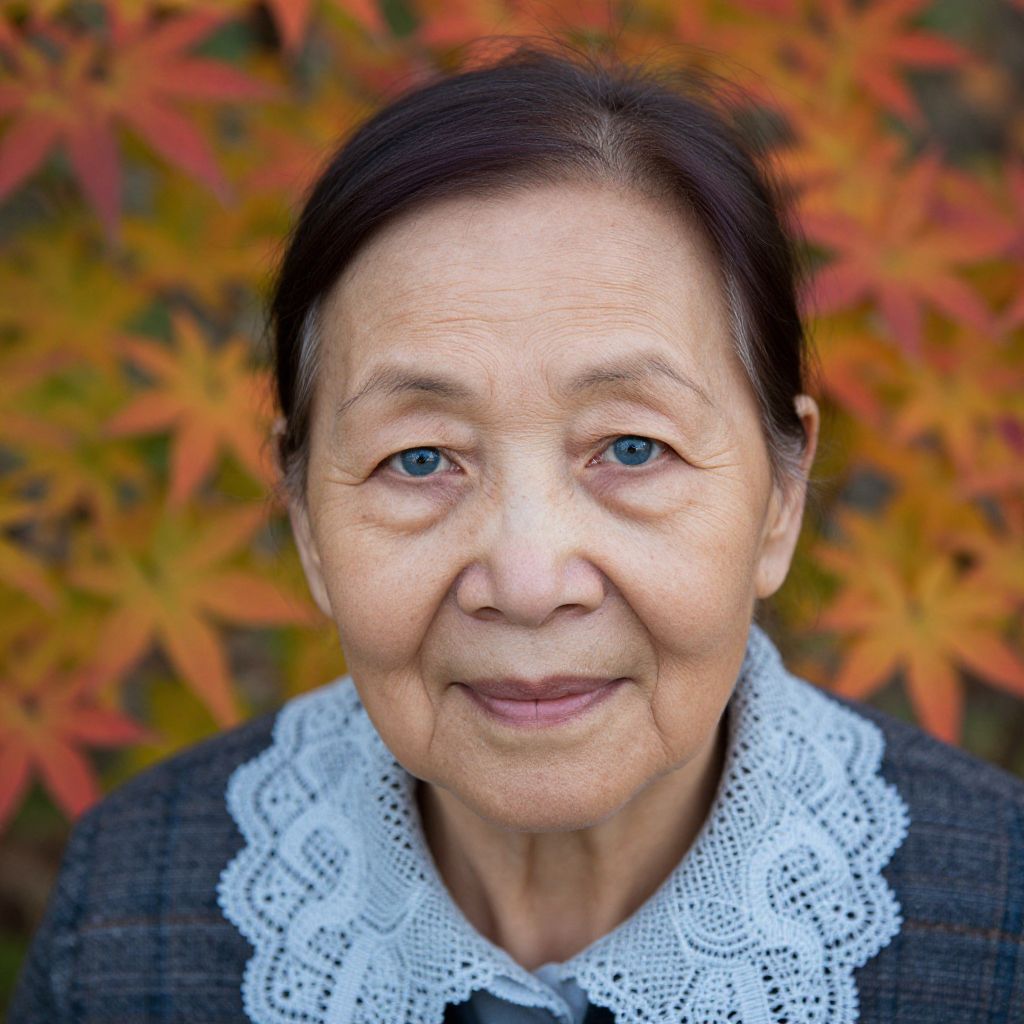 A serene portrait of an elderly East Asian woman showcases her porcelain skin and deep blue eyes amidst vibrant fall foliage. Captured from a unique bird's-eye perspective, this image highlights her delicate features and intricate lace collar, exuding timeless grace and a poignant blend of wisdom and innocence.