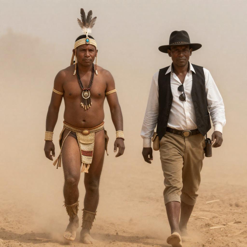 Photograph of two African American cowboys in a desert landscape. The front cowboy wears a white shirt, brown hat, and gray pants, holding a rifle. The rear cowboy wears a dark blue military-style jacket and beige hat, holding reins. Both stand beside a brown horse with a white saddle blanket. Red rock formations and a clear blue sky form the background.