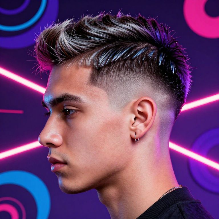 Photograph of a young man with light skin and a slim build, captured in profile. He has short, spiked hair with a mix of black and platinum blonde highlights, and a closely shaved undercut. His expression is serious, with a small earring in his left ear. He wears a black top. The background features a neon-lit design with pink and blue circular patterns and intersecting pink lines, giving a modern, club-like atmosphere. The lighting highlights his hair's texture and the contours of his face.