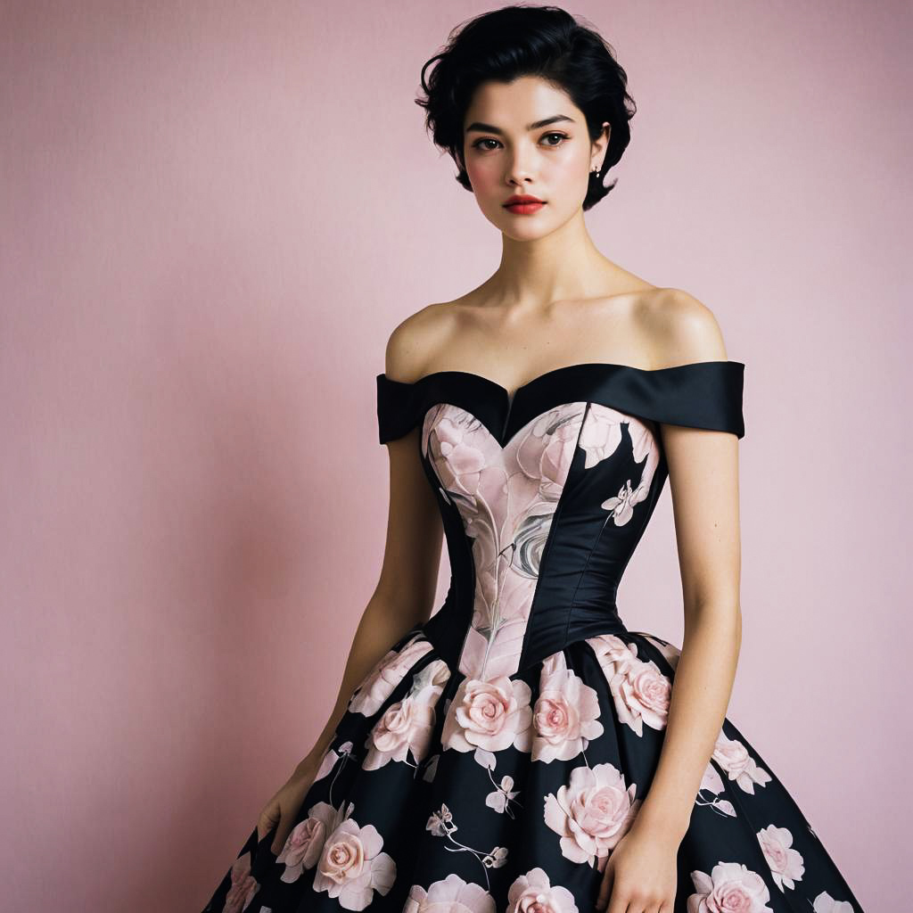 Your answer: Photo-shoot, blushing teenage girl, short straight black hair, hourglass figure, Off-Shoulder Corset Cocktail Dress, photo by Tim Walker, Crisp Flocked Fabric Pattern studio background