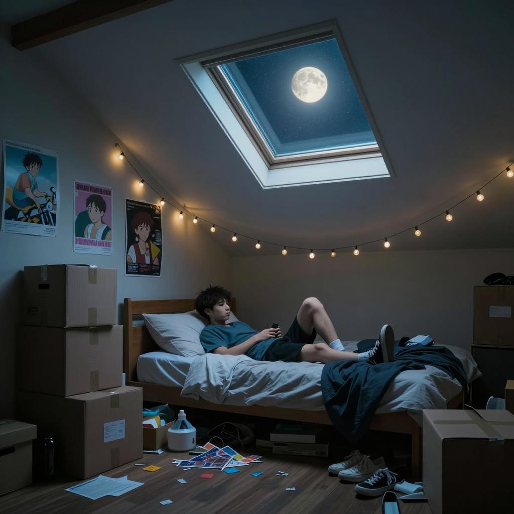 Long Shot a messy attic bedroom of a teenager, half unpacked moving boxes everywhere, a few posters have been put on the walls and some string lights hang randomly, nighttime, room is lit by the moonlight coming through the skylight window and the tiny string lights, blue tones, low angle, atey ghailan, studio ghibli, moody,