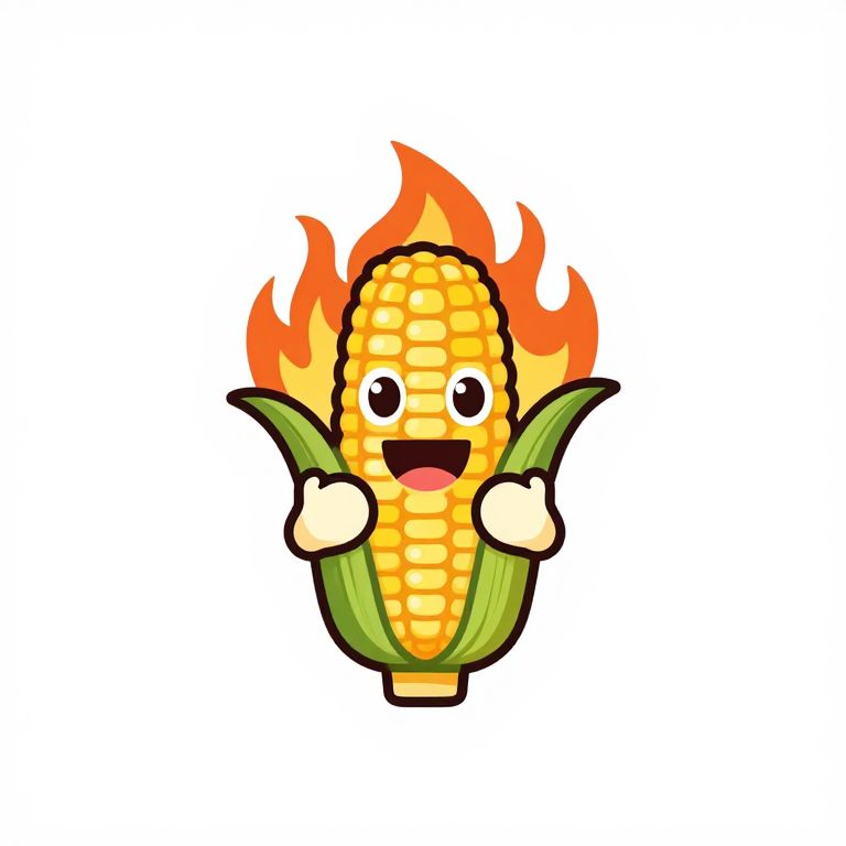"Image-Based Lighting The logo design features a charcoal-grilled corn with flames in the background. The corn has adorable eyes, hands, and a smiling mouth.,"