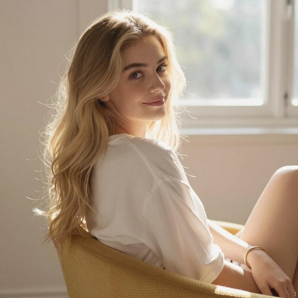Photograph of a young woman with long, light brown hair, illuminated by blue and purple neon lights. She wears an off-shoulder, light green top and gazes slightly to the side with a soft expression. Her right hand rests on her shoulder. The background is dark, enhancing the neon glow on her face and clothing.