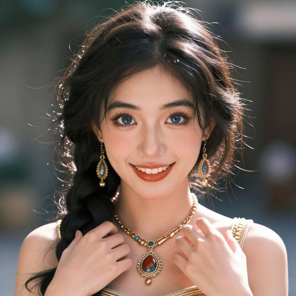 "picapiedra costume, 1girl, necklace, solo focus, blue eyes, jewelry, looking at viewer, fringe trim, blurry, hat, blurry background, red scarf, headdress, smile, braid, flower, long hair Realistic photo of casual sexy person with pretty face"